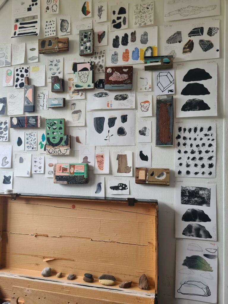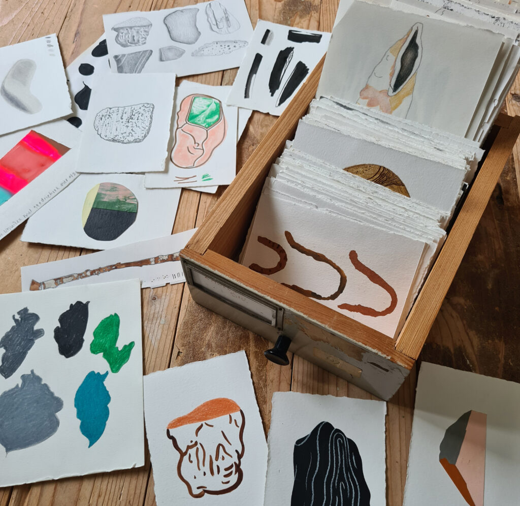 Hun vormen, kleuren, structuren inspireren me en vind je duidelijk en minder duidelijk terug in het werk. Ik schilder en teken ze realistisch, illustratief of geabstraheerd. Die afwisseling in beeldtaal en materiaal, het experimenteren daarmee, dat vind ik heel leuk.