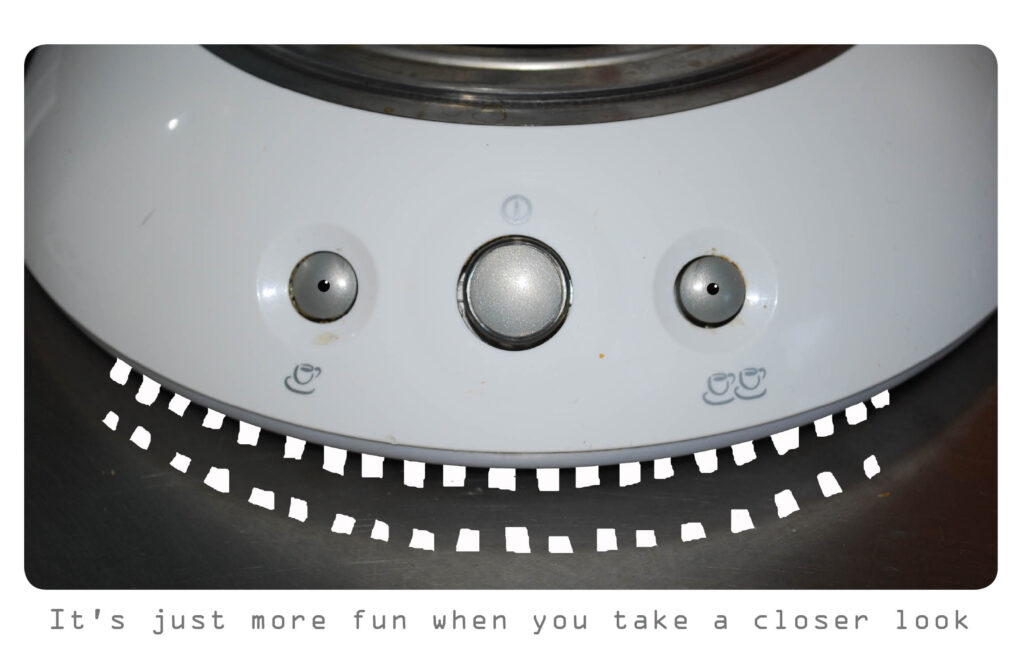 Mijn project Stop:Watch (voorheen ‘It’s just more fun when you take a closer look’, maar dat bleek niet zo’n praktische naam) luidde in 2012 een nieuwe fase in. Stop:Watch is een combinatie van fotografie en digitale illustratie (https://www.tinekemeirink.nl/stopwatch/). Het ontstond eigenlijk per ongeluk toen ik mezelf Photoshop aan wilde leren. Het gezichtje dat ik zag in het Senseo apparaat was mijn eerste Photoshop-poging. Ik werkte tot die tijd alleen maar analoog en Photoshop was abracadabra voor mij.