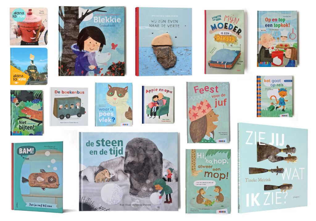 Als ik geen opdracht had, bedacht ik ze zelf om mijn portfolio te vullen (geen pdf-je, maar een echte fysieke map) en deed ik acquisitie (een mooi woord voor kopietjes van mijn werk maken bij de copyshop, in de bibliotheek adressen opzoeken, het werk rondsturen en daarna al die mensen bellen, jaja zo ging dat toen). Toen ik van Utrecht naar Groningen verhuisde voor de liefde, stopte ik bij Meulenhoff. Nu was ik fulltime illustrator. Er volgden boeken, heel veel boeken, inmiddels zo’n 150 gok ik, tijdschriften, etalages, huisstijlen, posters, sieraden, t-shirts, we kregen een hond, Boris, onze kinderen werden geboren, we verhuisden naar buiten de stad, we kregen een praatgrage parkiet, Bram, ik volgde de beroepskunstenaar in de klas opleiding en ging lesgeven en illustreerde het ene boek/tijdschrift na het andere. Dat ging het ene jaar beter dan het andere (en nog steeds is er geen peil op te trekken). Maar hee, ik ben er nog steeds! Al 30 jaar! (Boris en Bram helaas niet meer).