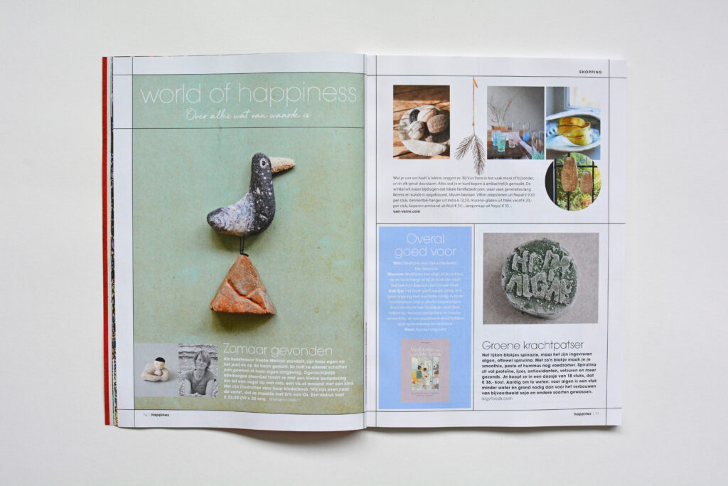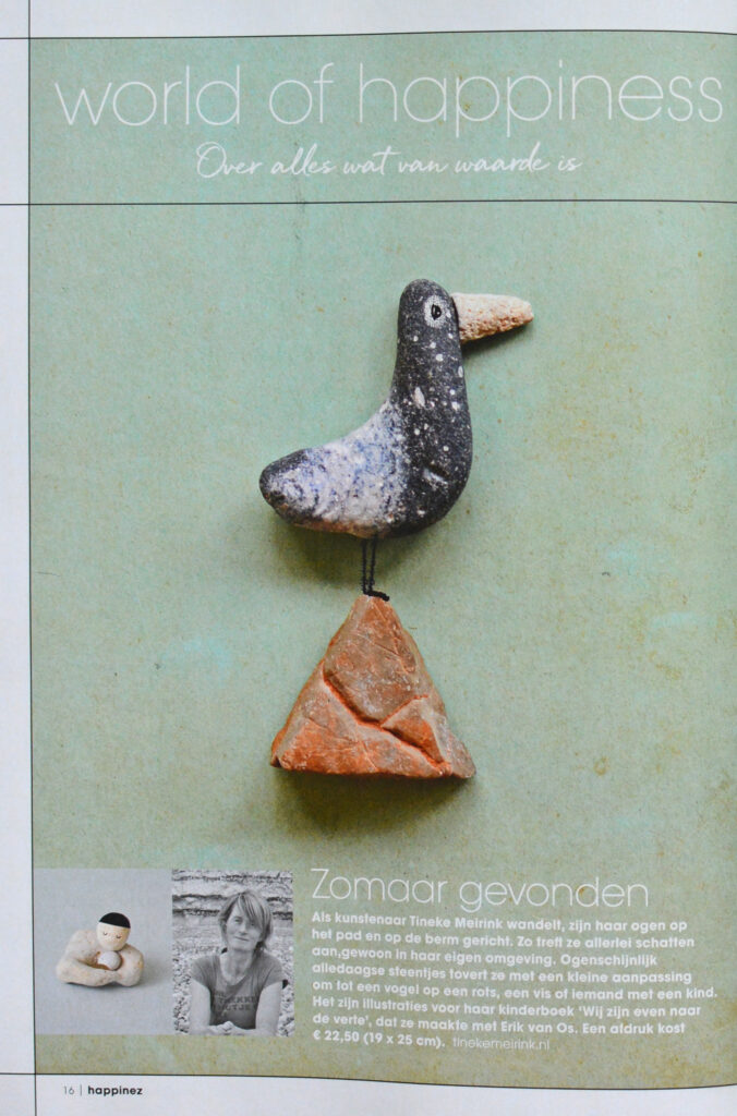 “Als kunstenaar Tineke Meirink wandelt, zijn haar ogen op het pad en op de berm gericht. Zo treft ze allerlei schatten aan, gewoon in haar eigen omgeving. Ogenschijnlijk alledaagse steentjes tovert ze met een kleine aanpassing om tot een vogel op een rots, een vis of iemand met een kind. Het zijn illustraties voor haar kinderboek ‘Wij zijn even naar de verte’, dat ze maakte met Erik van Os. Een afdruk kost €22,50 (19 x 25 cm)“. (Happinez, november 2024).