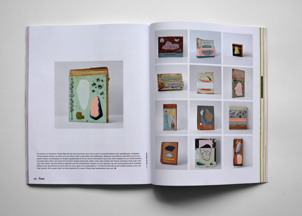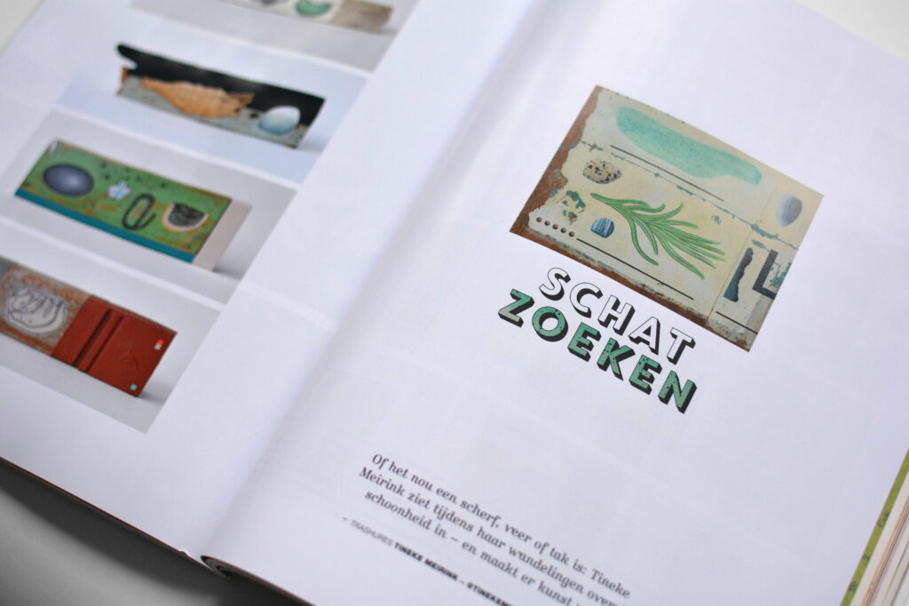“Kunstenaar en illustrator Tineke Meirink laat zich inspireren door wat ze ziet en verzamelt tijdens haar wandelingen: schijnbaar oninteressante dingen op straat of in de natuur. Haar composities van realistische, abstracte en grafische elementen op hout en papier hebben iets grappigs, en dragen tegelijkertijd uit hoe je overal schoonheid in kunt zien. Een roestplek op een afvalcontainer, een bijzondere steen, een fraaie tak of scherf, stukjes ijzerdraad, zaden, veren: alle schatten die Tineke onderweg vindt, gaan mee naar haar atelier. Als kind wilde ze eigenaar van een snoepwinkel worden, nu is ze eigenaar van een verzameling mooie vondsten. Nadat ze zijn gesorteerd op soort, kleur en vorm, gaan ze de opbergkist in – tot het moment dat ze de hoofdrol spelen in een van haar werken. Het is geen trash, het zijn trashures. Zo noemt Tineke haar kunstwerken dan ook”. (FLOW magazine nr.1 2025)