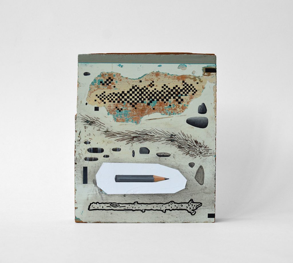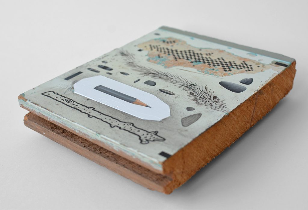 spuitbus, acrylgouache, acryl en wrijfletters op gevonden hout16.3 x 13.7 cm | verkocht