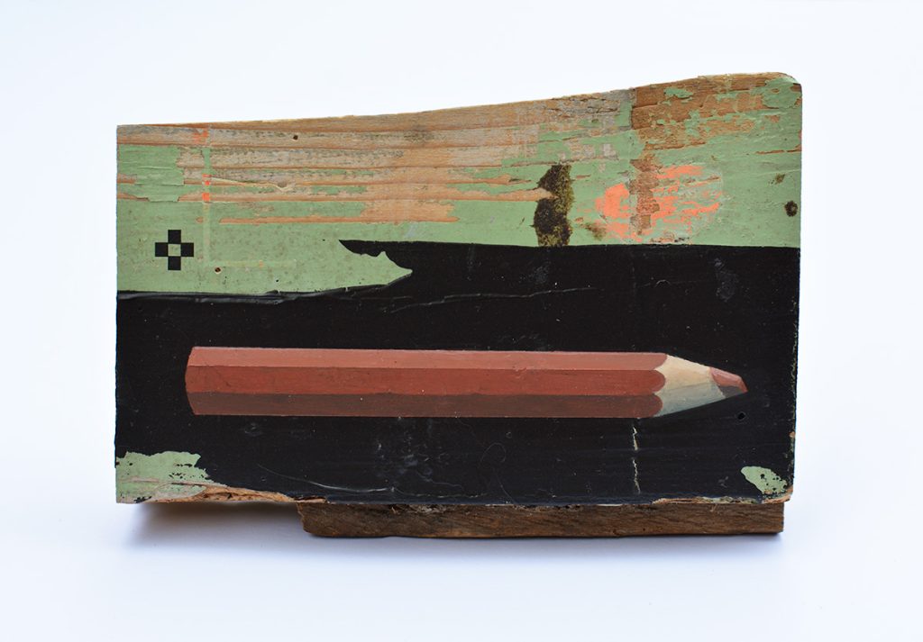 mixed media op gevonden hout10.8 cm x 7.5 cm | verkocht