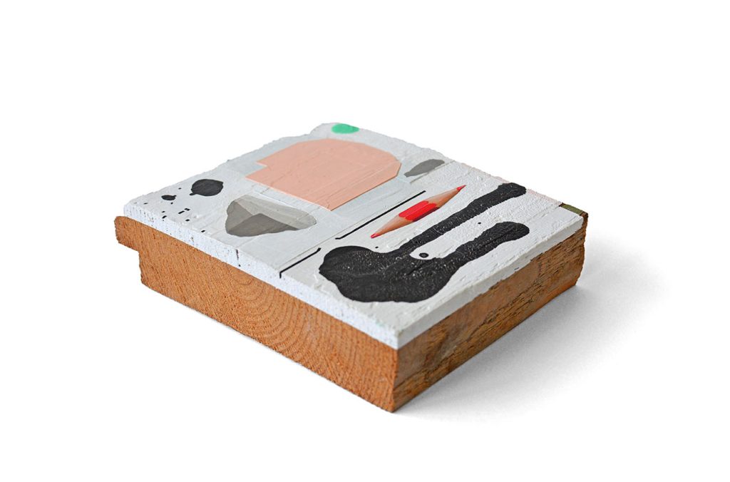 Acryl gouache, posca, dry transfer em medium op gevonden hout13.5 cm x 10 cm x 3.2 cm